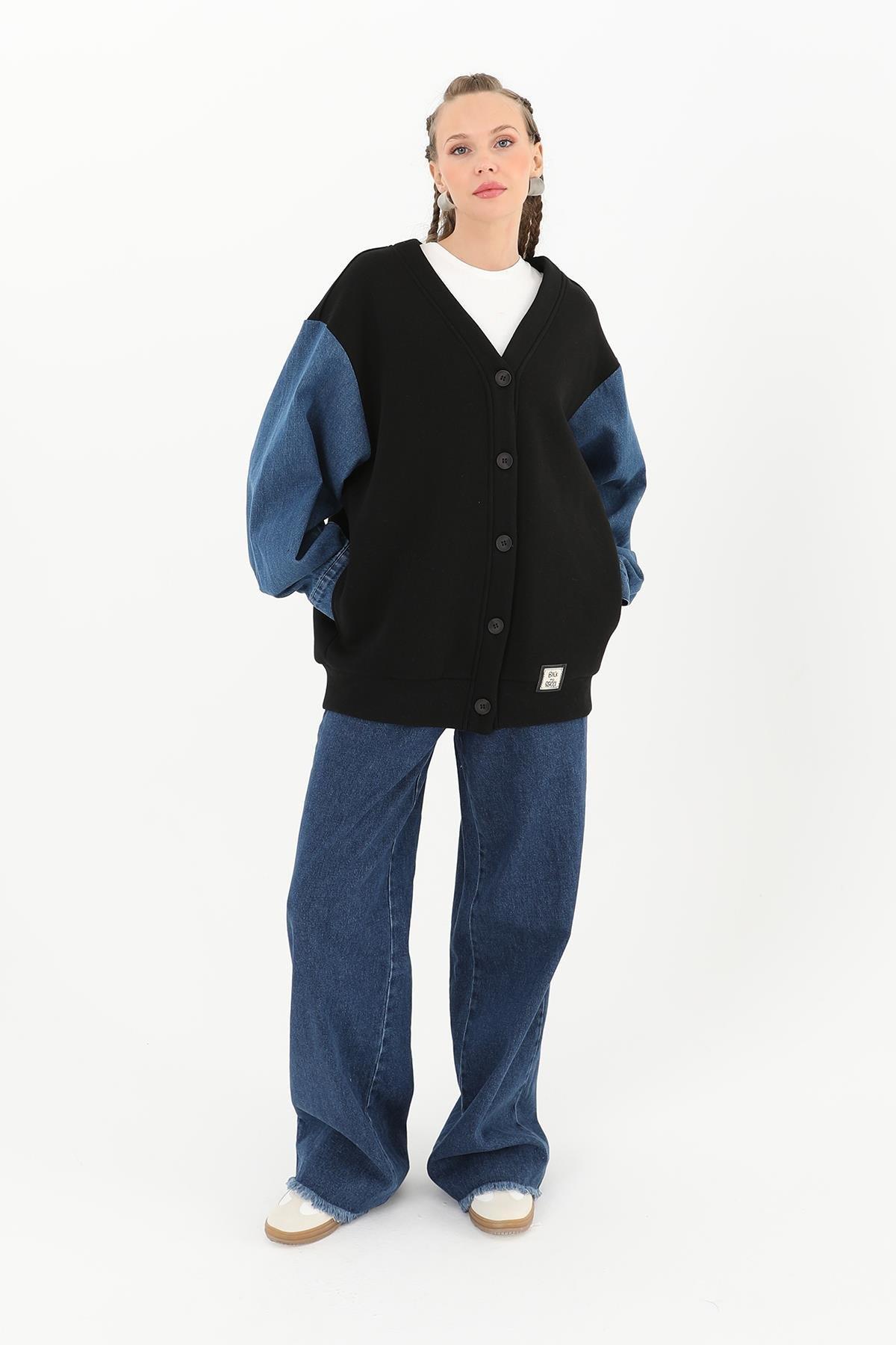 ODRESS_Hırka_Kadın Beden Üç İplik Kollar Denimli Hırka 32043 Odress Soul BLACK