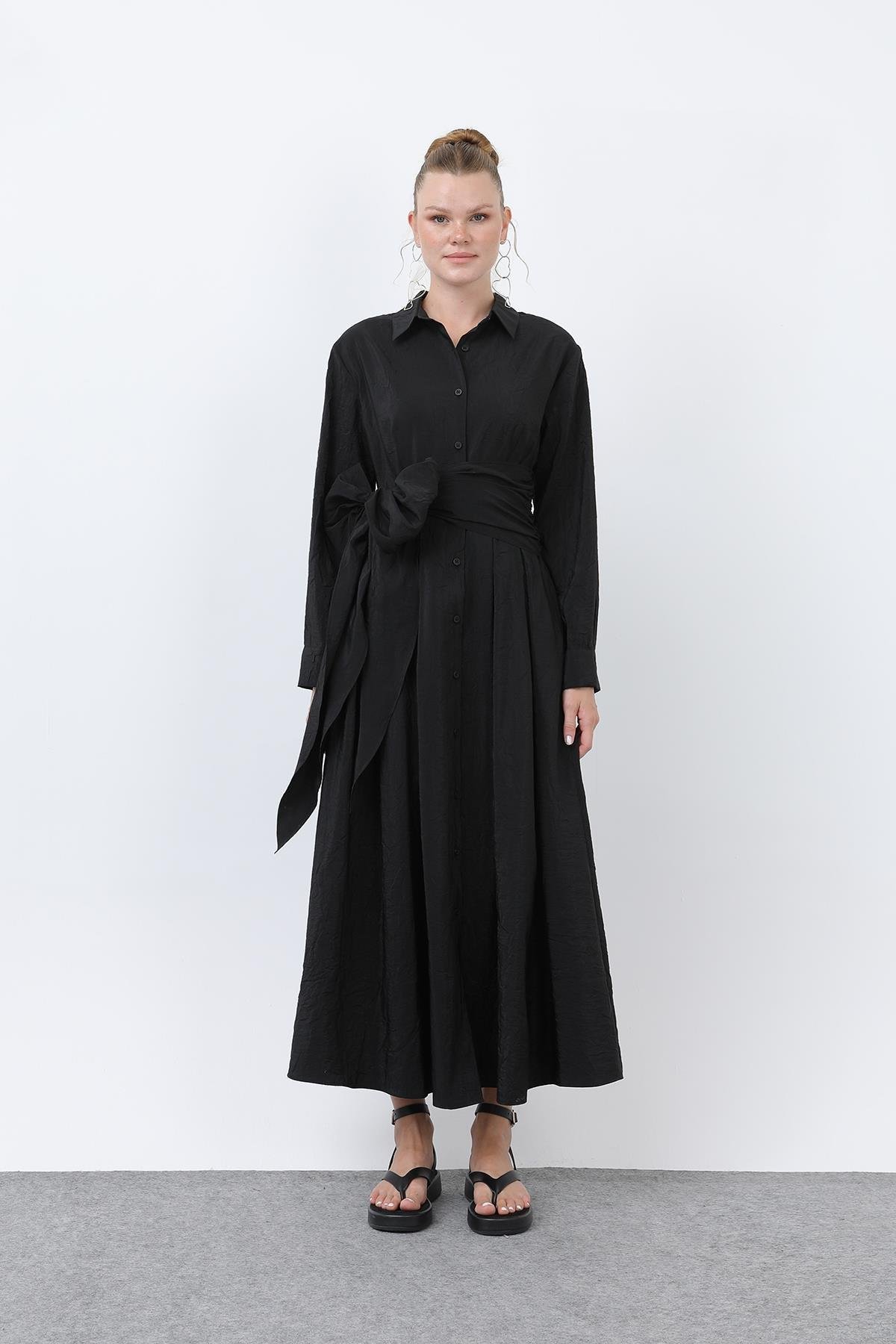 Kadın Belden Bağcıklı Gömlek Elbise 20661 Odress BLACK