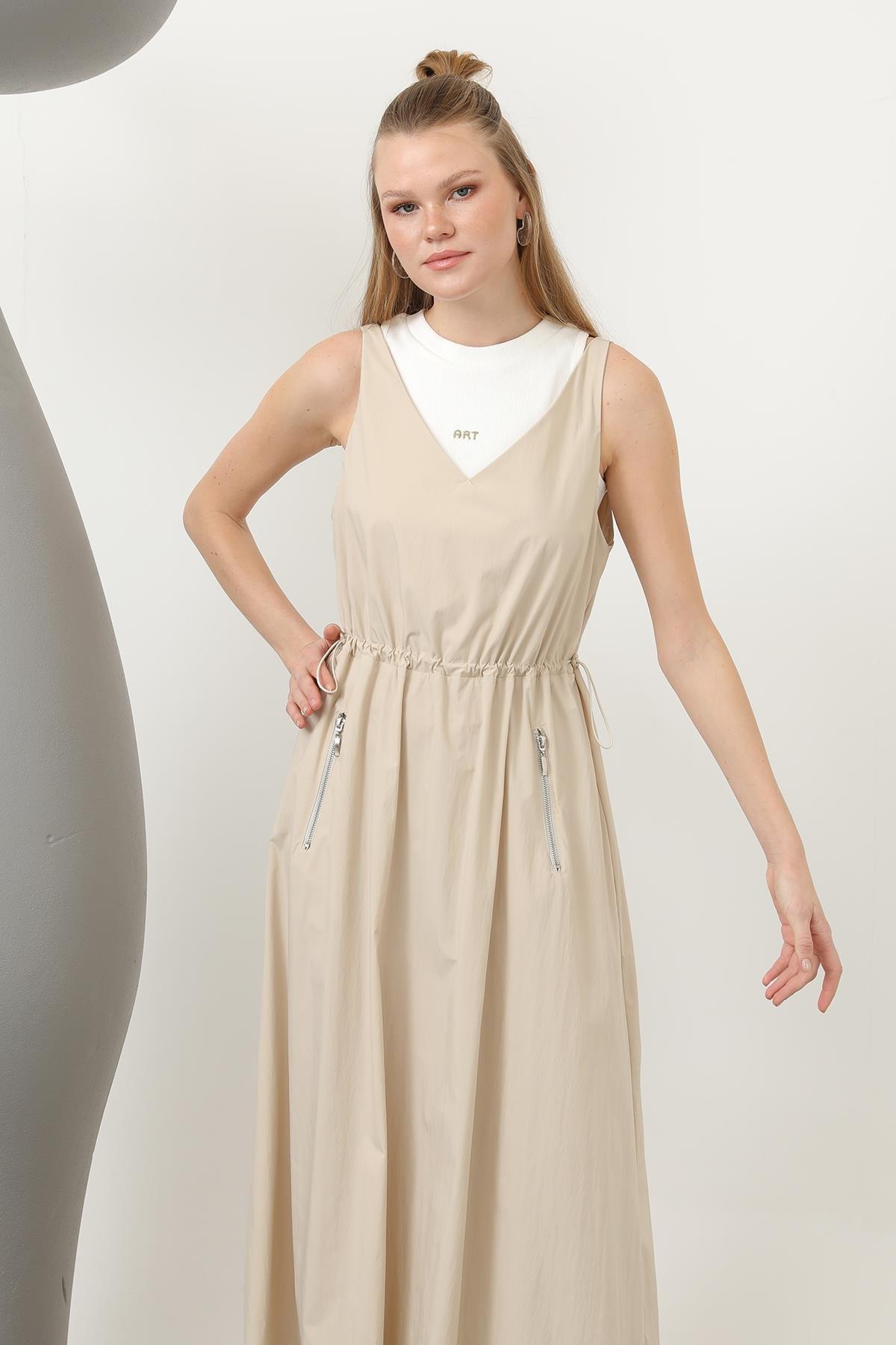 ODRESS_Elbise_Kadın Belden Stoperli Fermuar Detaylı Paraşüt Jile 32147 Odress Soul BEIGE