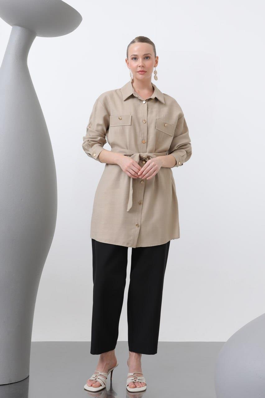 Kadın Cep Ve Kuşak Detay Gömlek Tunik 10658 Odress CAMEL