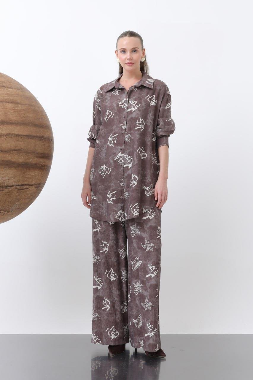 Kadın Çiçek Desen Önü Kısa Arkası Uzun Oversize Tunik Gömlek 10670 Odress BROWN