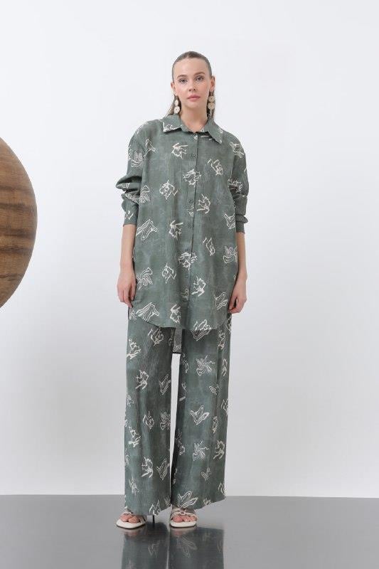 ODRESS_Gömlek_Kadın Çiçek Desen Önü Kısa Arkası Uzun Oversize Tunik Gömlek 10670 Odress HAKİ