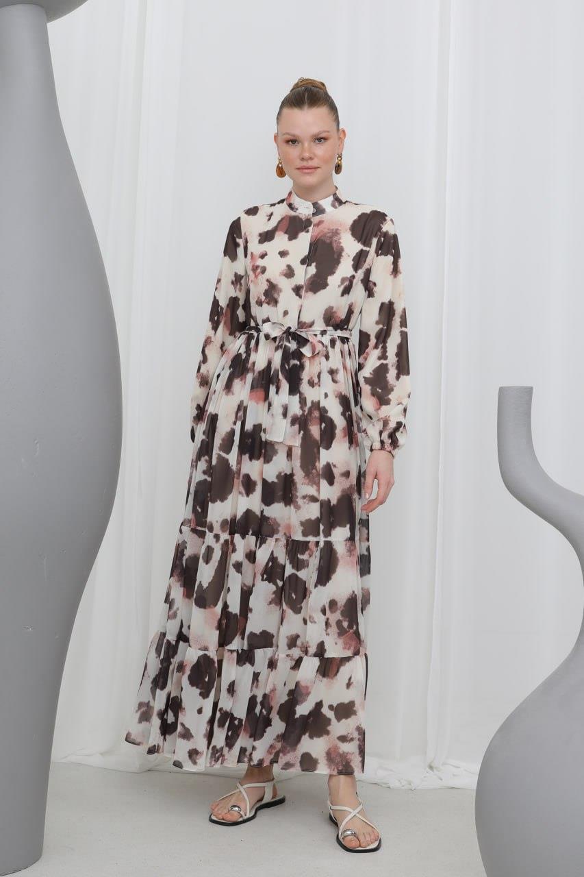 Kadın Desenli Şifon Elbise 12601 Odress Puane BEİGE BROWN