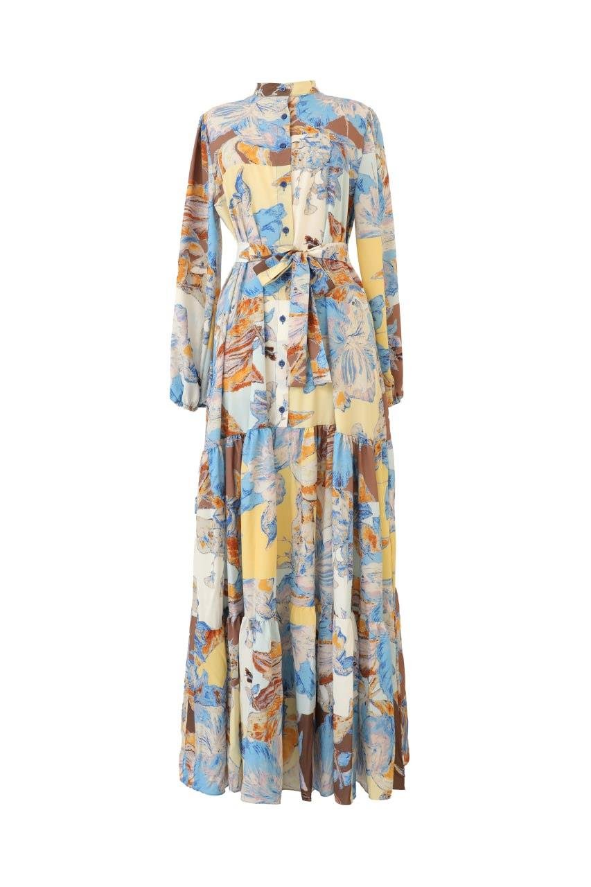 ODRESS_Uzun Elbise_Kadın Hakim Yaka Kuşaklı Desenli Elbise 12634 Odress BLUE