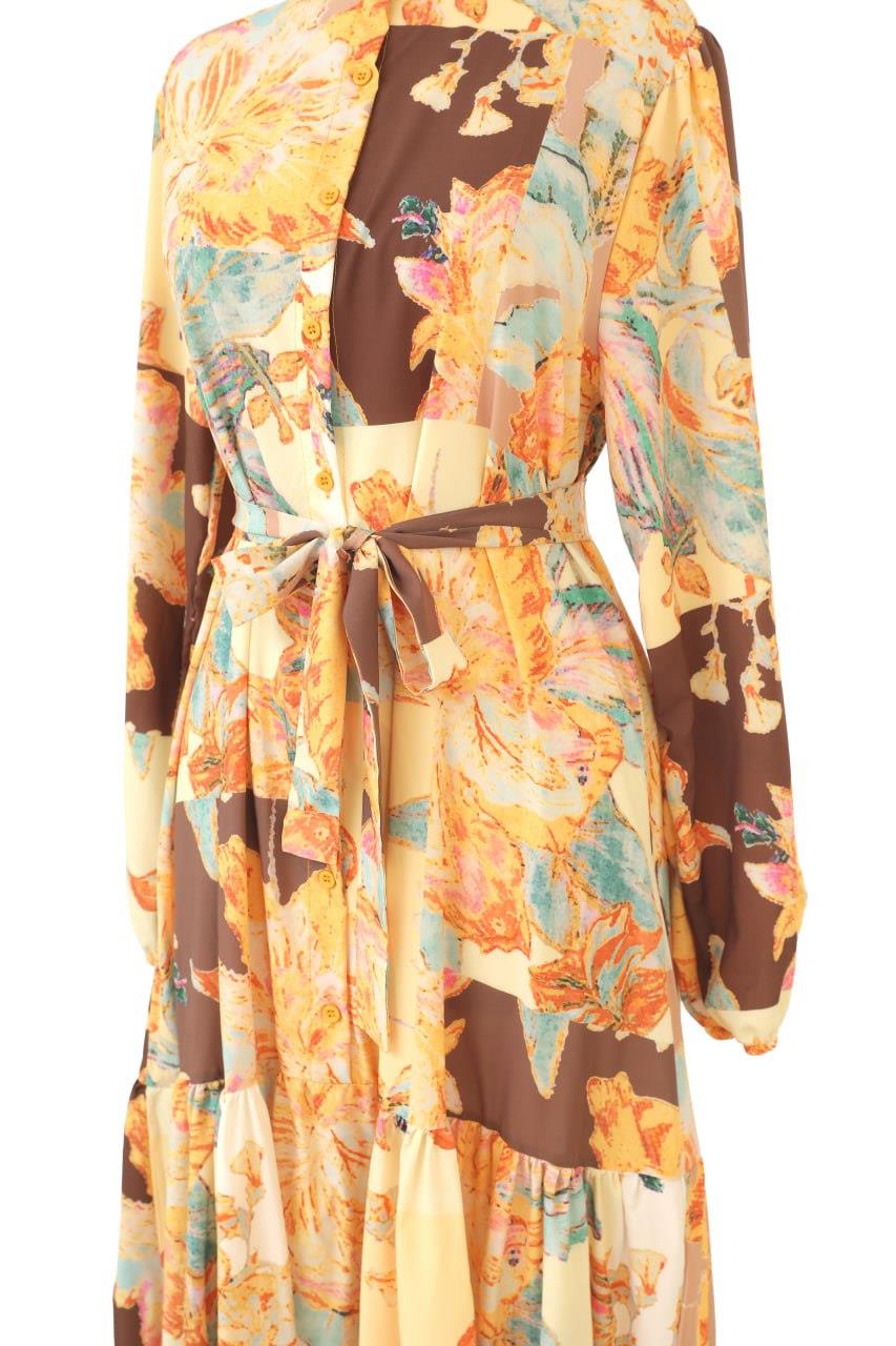 ODRESS_Uzun Elbise_Kadın Hakim Yaka Kuşaklı Desenli Elbise 12634 Odress YELLOW