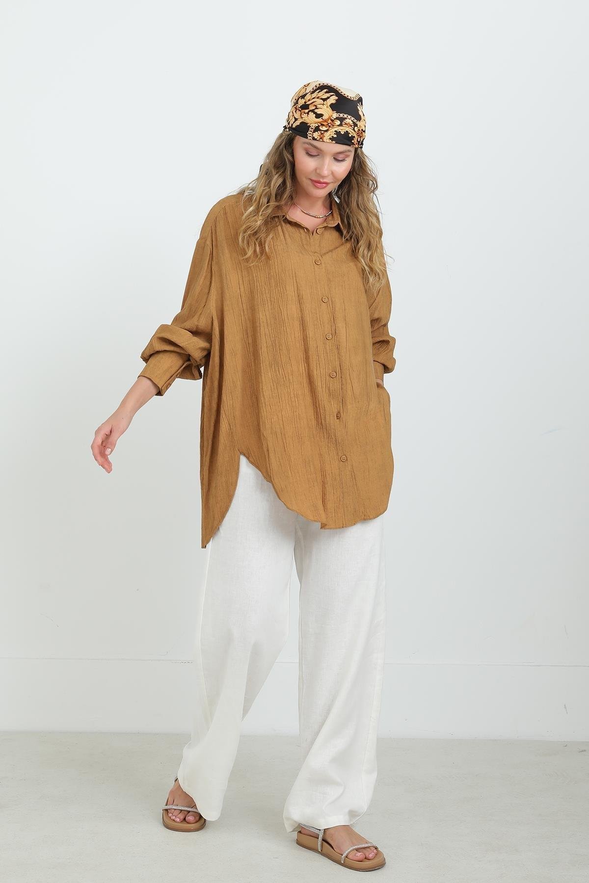 Kadın Kendinden Desenli Oversize Gömlek 10638 Odress Puane CAMEL