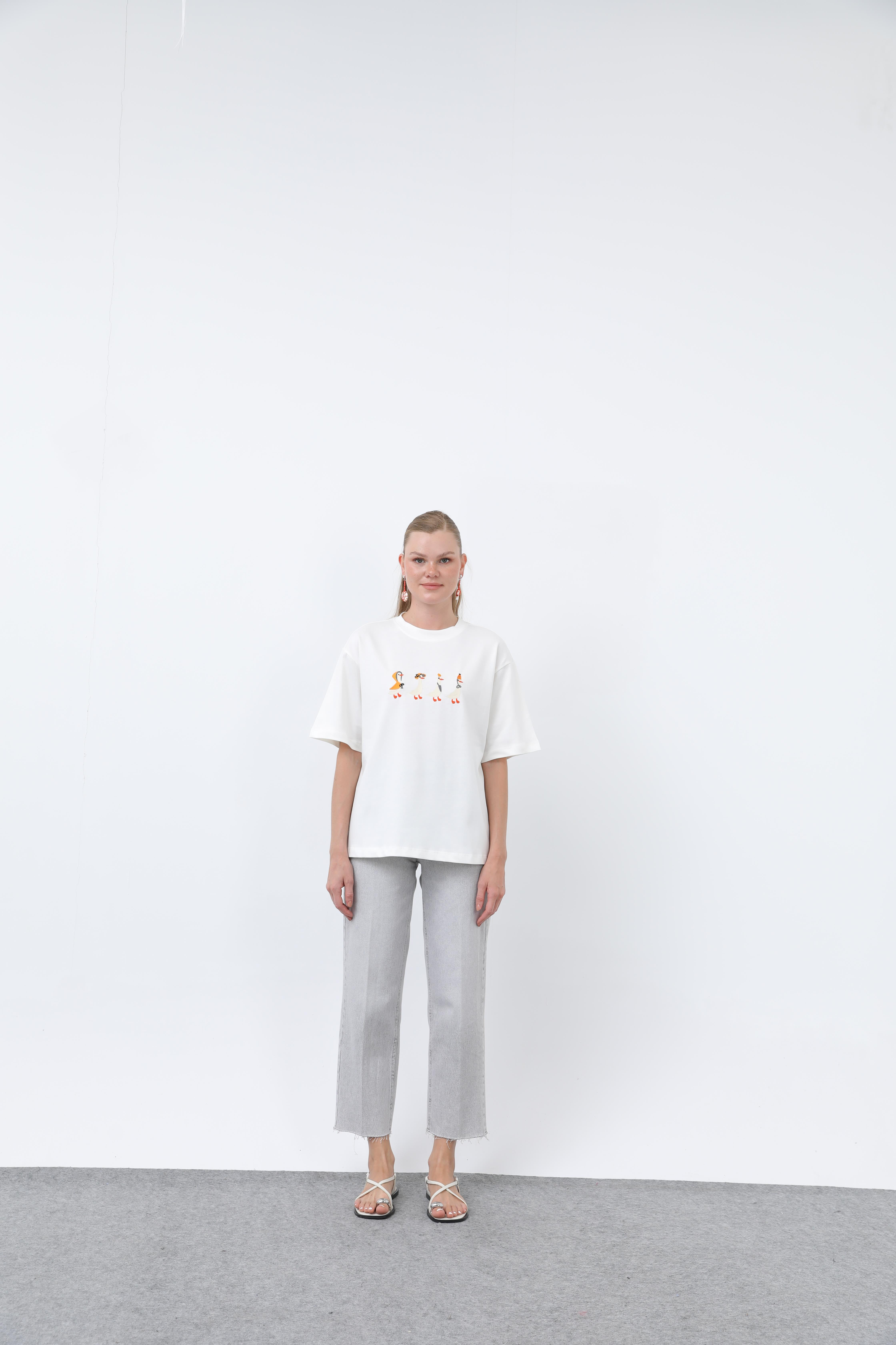 Kadın Nakış Detaylı Kısa Kollu Tshirt 32360 Odress ECRU