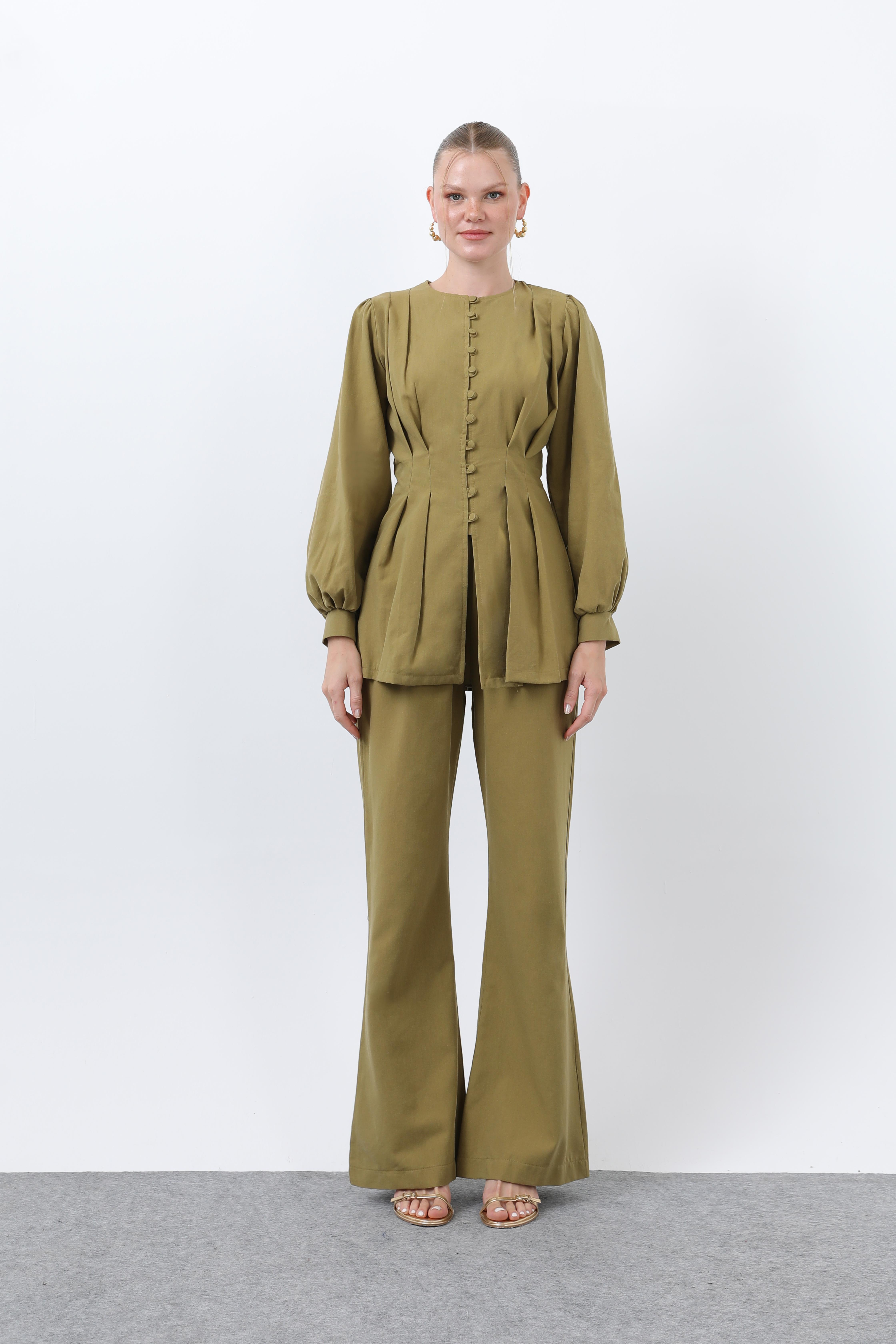 Kadın Önden Düğmeli Pileli Keten Pantolon Takım 20687 Odress OLİVE