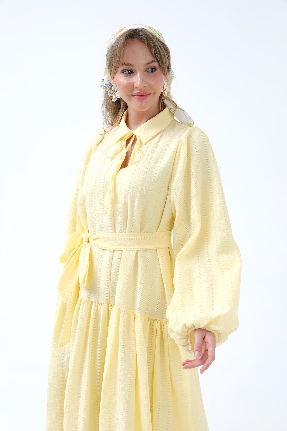 Kadın Polo Yaka Önden Bağcıklı Balon Kol Elbise 12628 Odress YELLOW